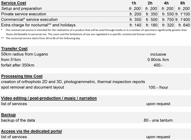 Characteristics of the services Commercial service The hourly cost shown is related to a service including the transfer, the activation of the system and approximately 50% of the time as shooting time (according to the operational situation, the weather and the customer satisfaction). In principle the offered service is complete and no additional costs has to be considered. In any case, for a precise estimate or for services that needs processing time, it is required a discussion to identify the best solution for your needs. Contracts, applications and special subscriptions |